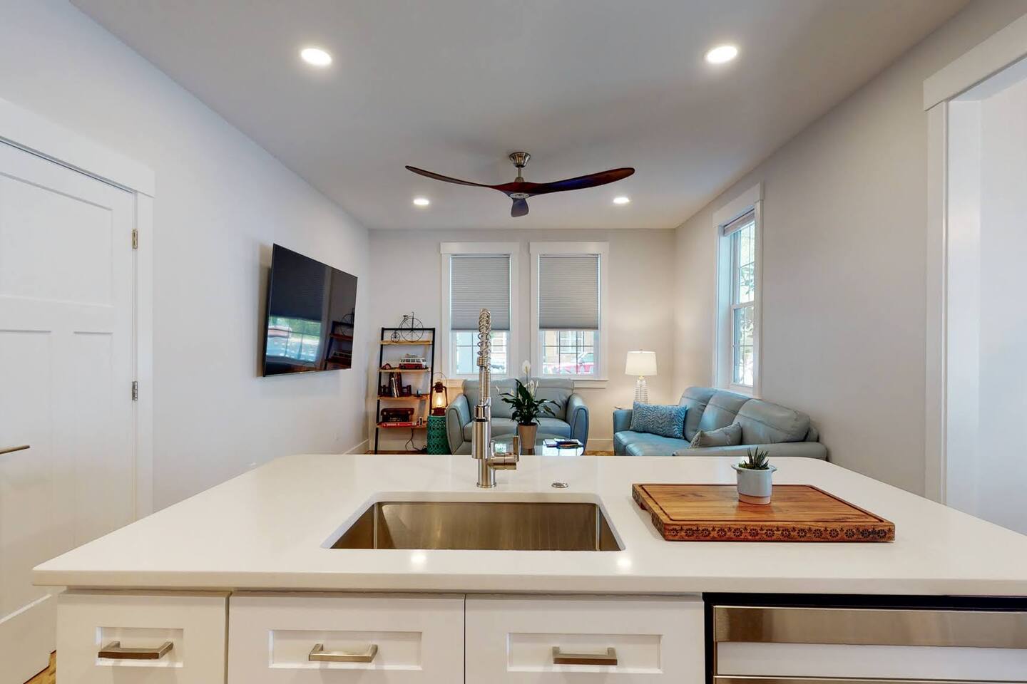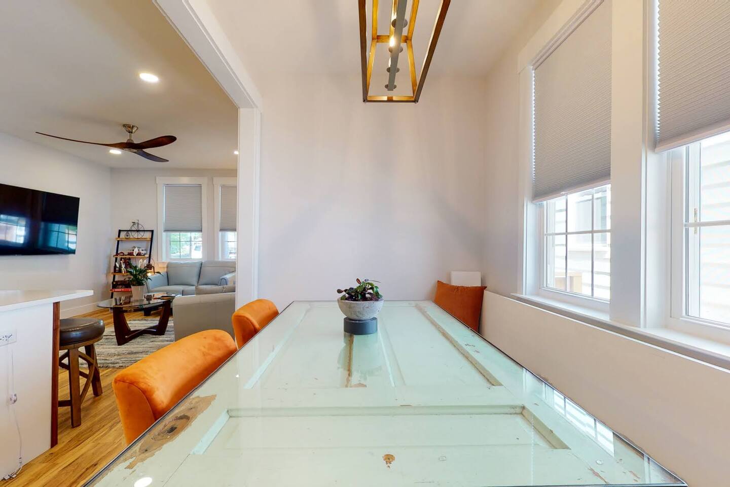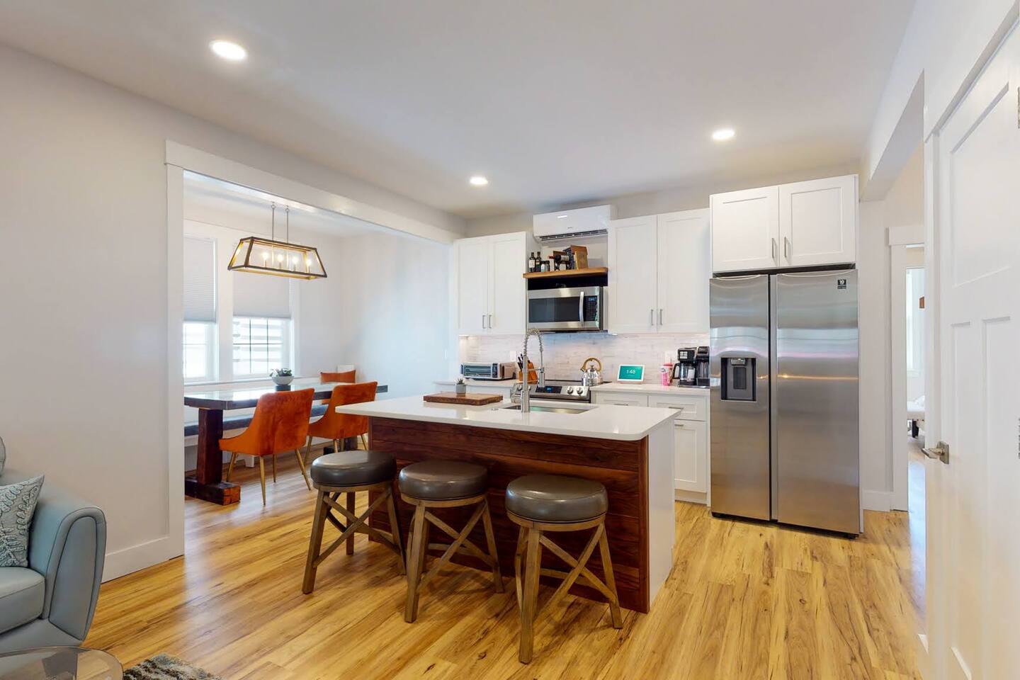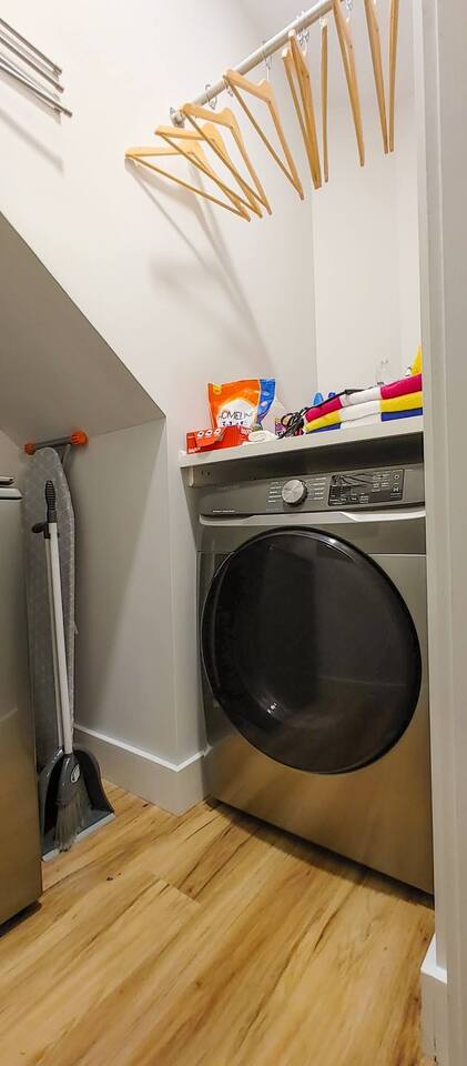Welcome to your tranquil 1100 sq. ft. retreat in a newly renovated historic home, originally built in 1903! This downstairs unit perfectly blends eclectic charm with state-of-the-art technology for a clean, quiet, and memorable stay. The open-concept living area features a stunning 75" OLED Smart TV, perfect for relaxing after a day of exploring. Step outside to your private patio oasis to unwind. The fully equipped, modern kitchen and unique dining table, made from a reclaimed door, are perfect for enjoying a meal at home. With great natural light throughout, the entire space feels bright and inviting. This unit includes: Two comfortable bedrooms (1 King bed, 1 Queen bed) A dedicated desk space for remote work or planning your adventures One full bathroom with a modern walk-in shower High-speed internet and SMART home technologies In-unit washer and dryer