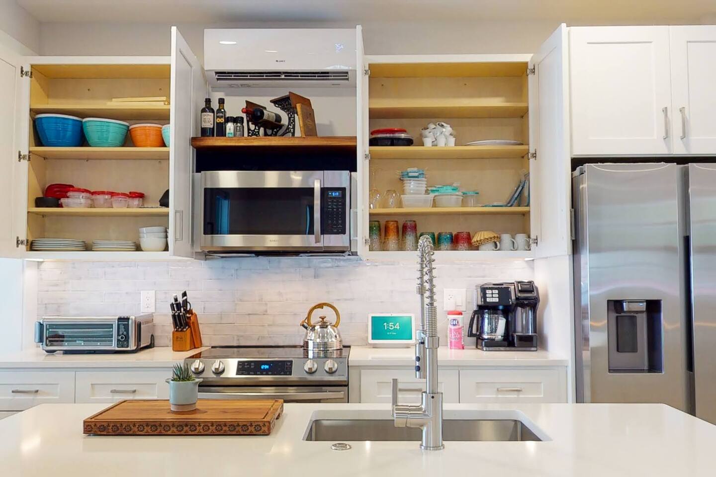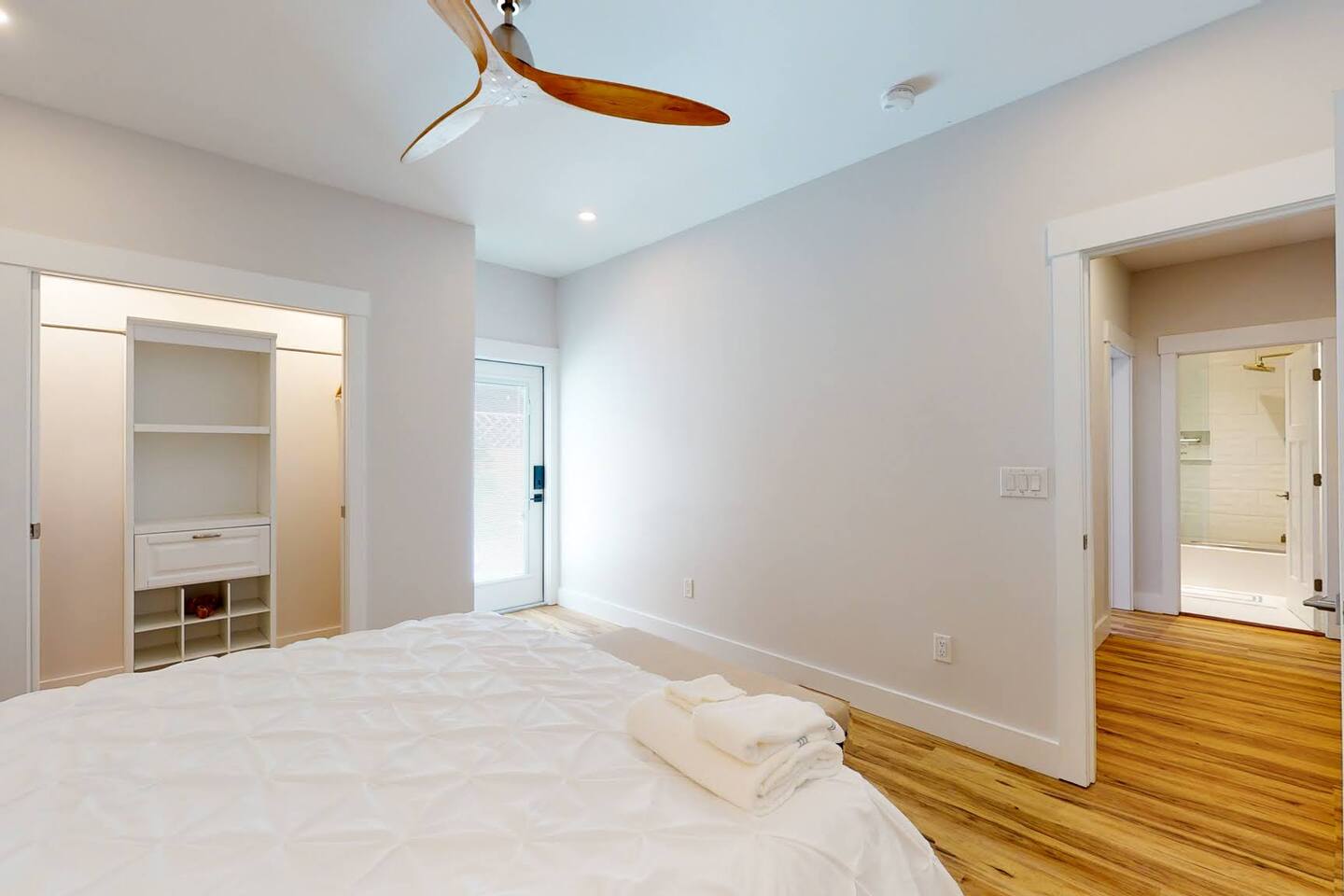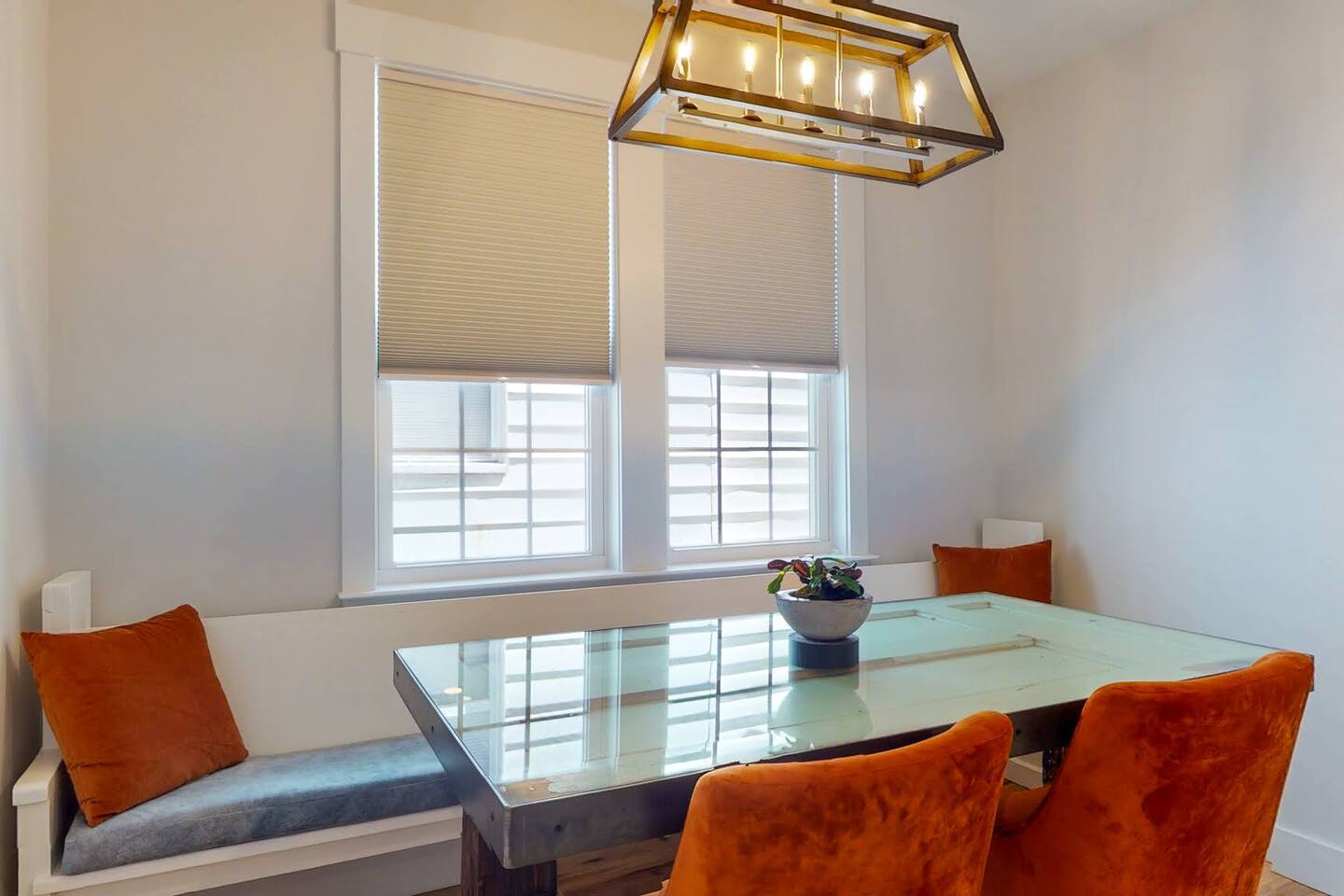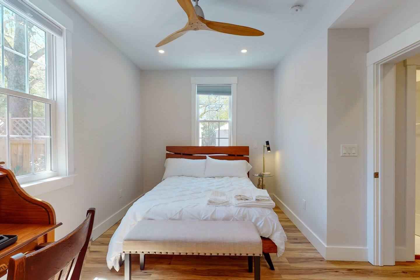 Welcome to your tranquil 1100 sq. ft. retreat in a newly renovated historic home, originally built in 1903! This downstairs unit perfectly blends eclectic charm with state-of-the-art technology for a clean, quiet, and memorable stay. The open-concept living area features a stunning 75" OLED Smart TV, perfect for relaxing after a day of exploring. Step outside to your private patio oasis to unwind. The fully equipped, modern kitchen and unique dining table, made from a reclaimed door, are perfect for enjoying a meal at home. With great natural light throughout, the entire space feels bright and inviting. This unit includes: Two comfortable bedrooms (1 King bed, 1 Queen bed) A dedicated desk space for remote work or planning your adventures One full bathroom with a modern walk-in shower High-speed internet and SMART home technologies In-unit washer and dryer